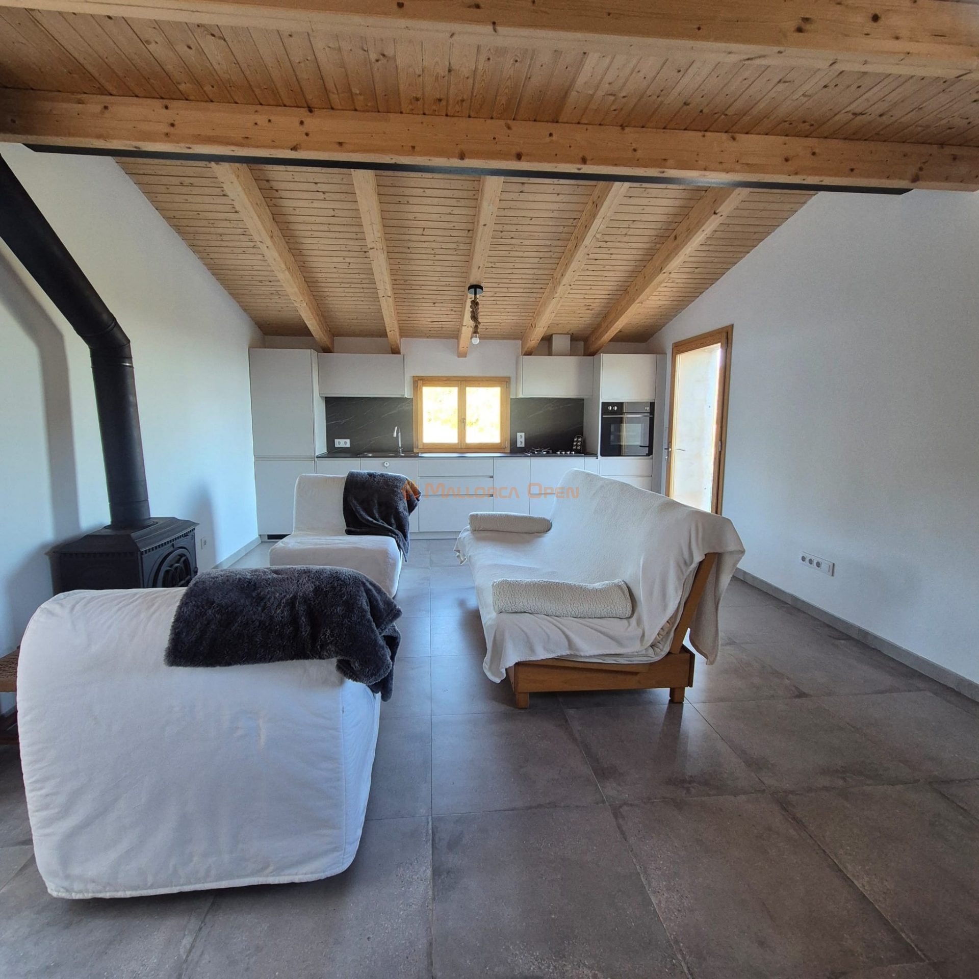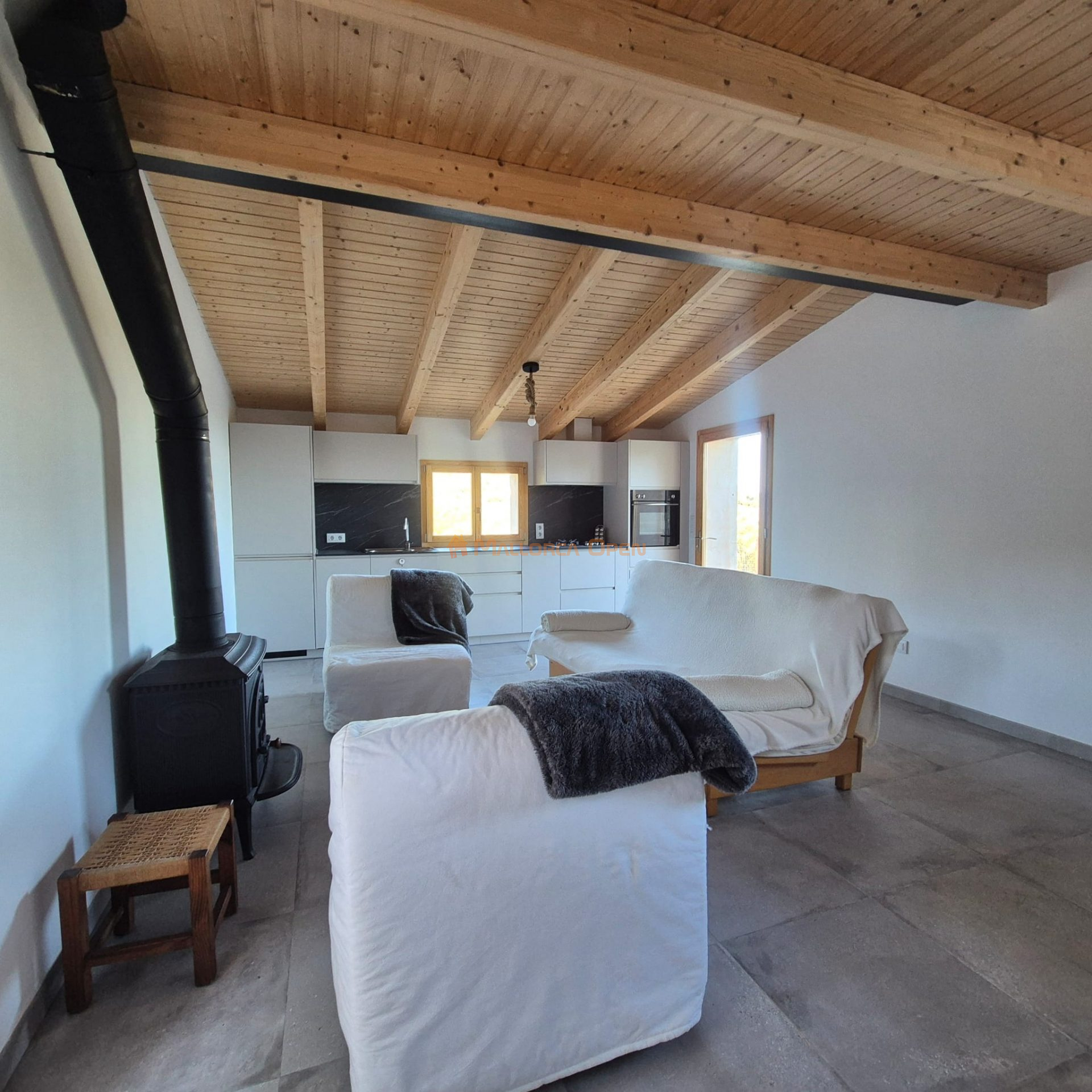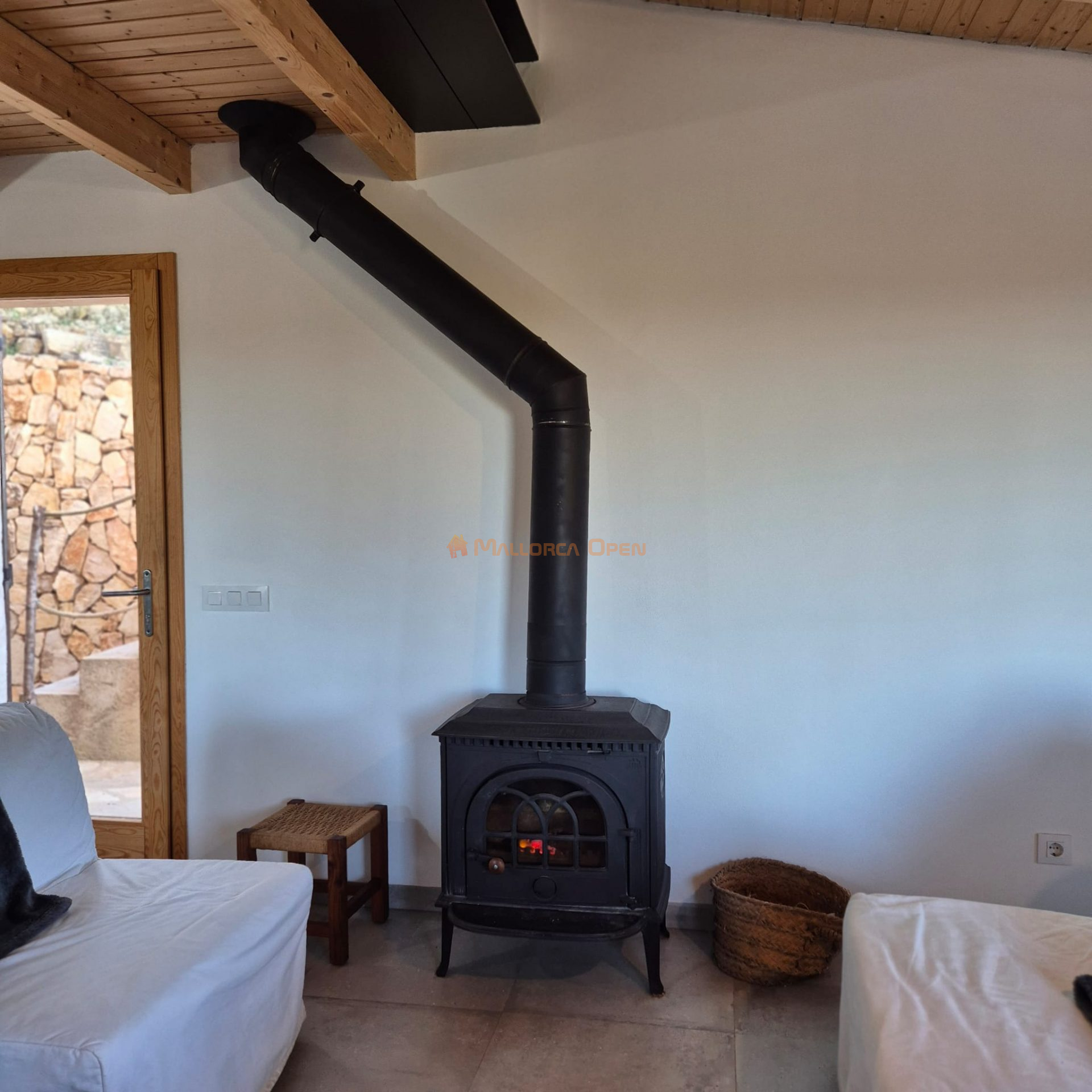 Con una fachada exterior de piedra compuesta, esta casa de planta baja ofrece una distribución de espacio totalmente abierto con cocina americana y un baño, creando un ambiente acogedor y contemporáneo. La habitación en la parte superior añade un toque de intimidad.