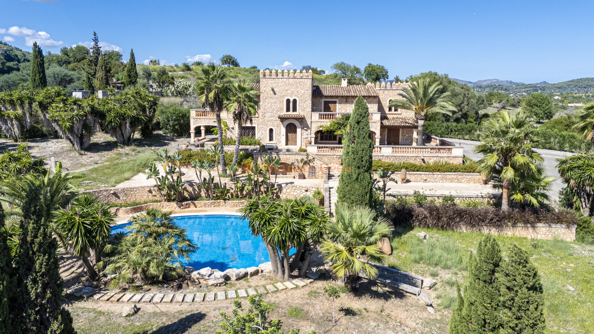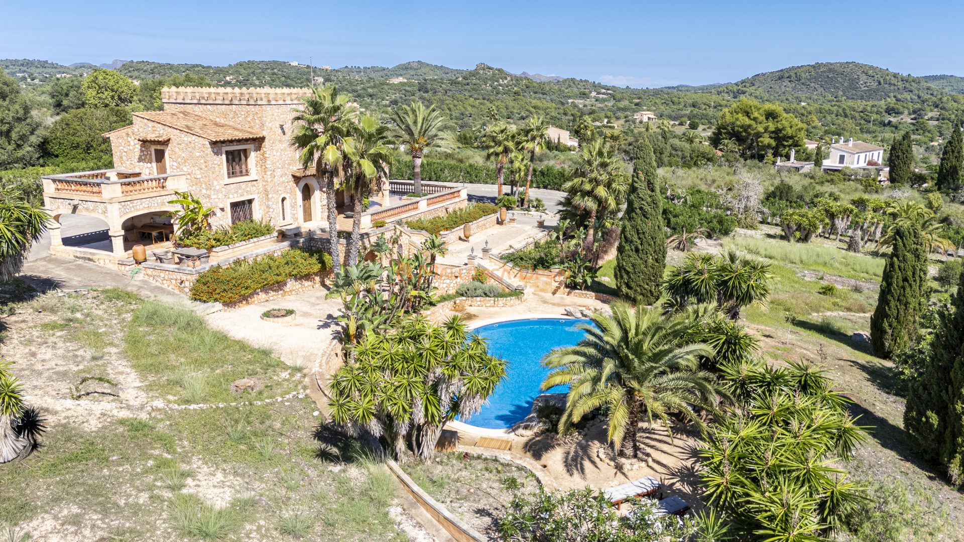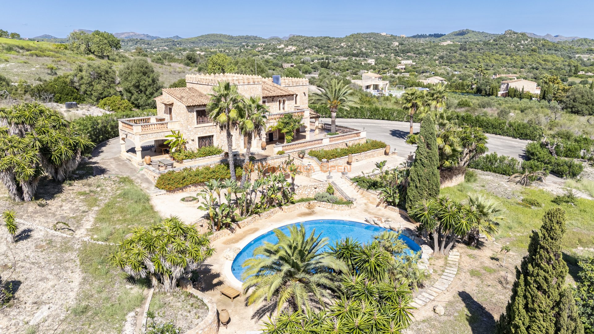 En el exterior, los extensos jardines paisajísticos con árboles frutales ofrecen un entorno natural y relajante. La finca garantiza privacidad gracias a sus muros dobles de piedra y a su acceso asfaltado hasta la entrada.