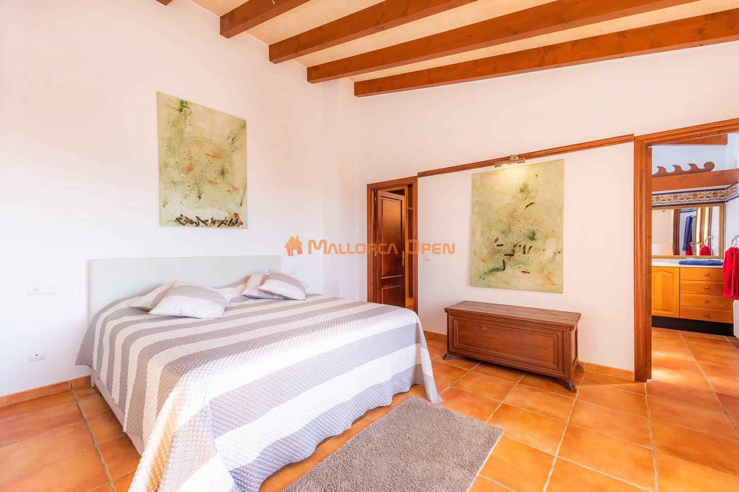 La vivienda, de 400 m², se distribuye en amplios espacios con detalles señoriales como arcos y vigas vistas. Dispone de cinco dormitorios en suite y un total de seis baños, además de estancias luminosas que transmiten elegancia y confort.